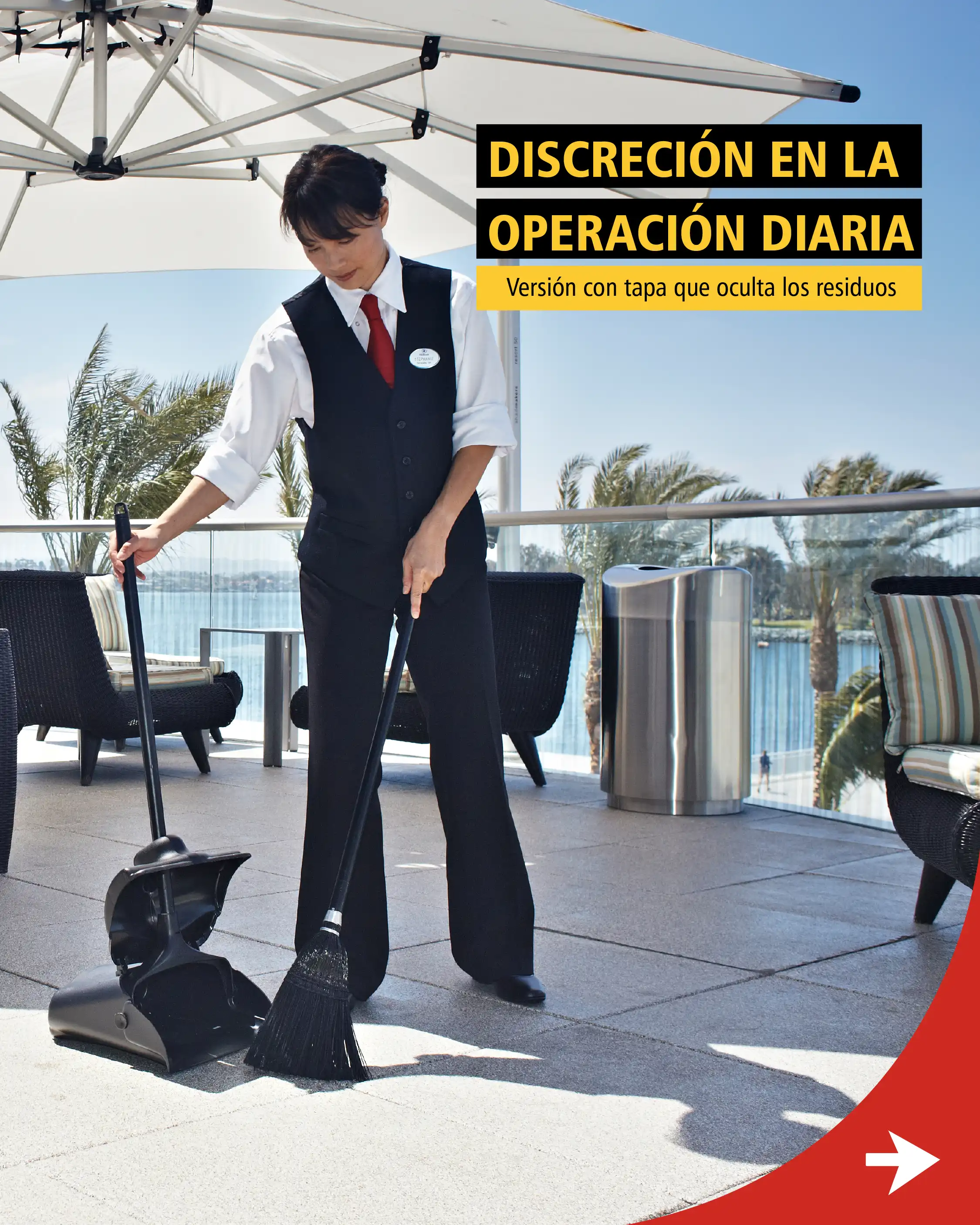 Los Recogedores Lobby Pro® están diseñados para operar en áreas de alto tráfico sin afectar la experiencia del cliente. Con bastón largo, ruedas resistentes y opción con tapa para ocultar los residuos.