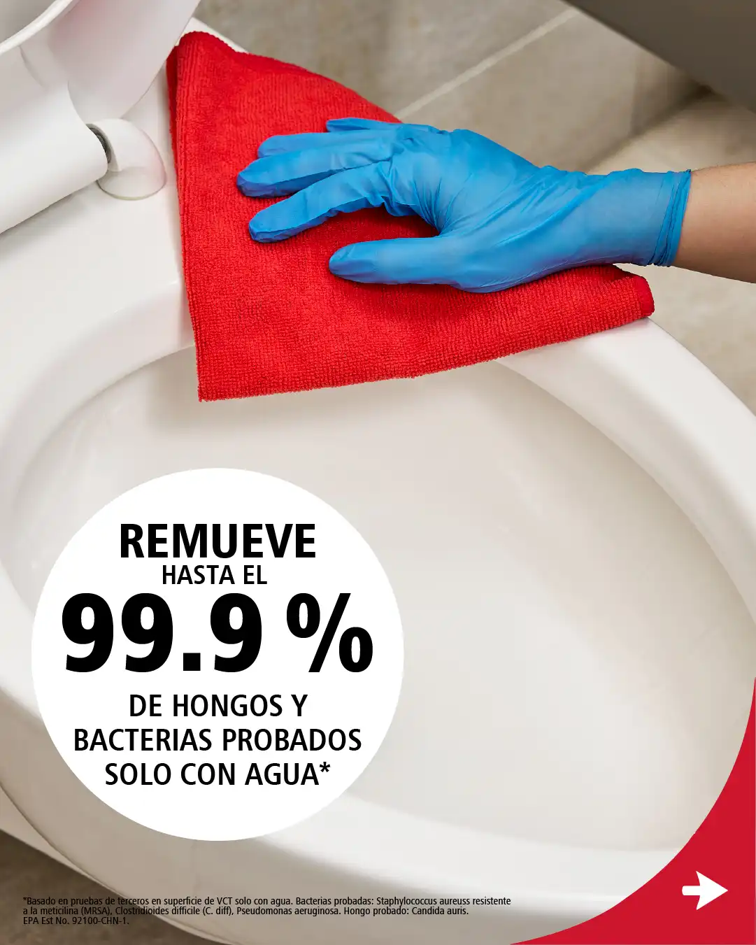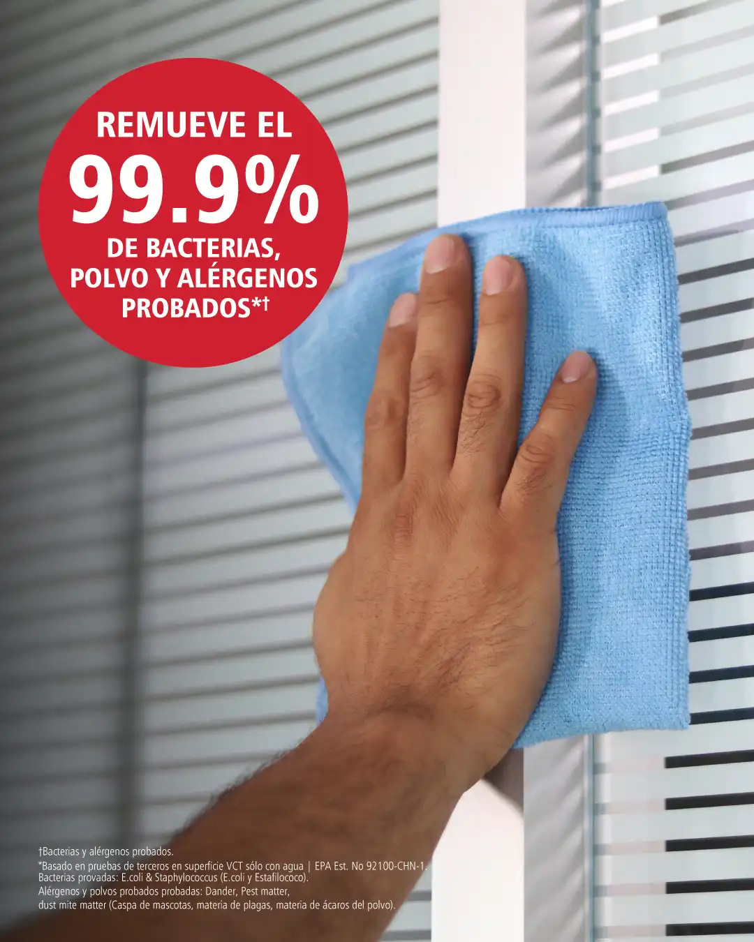 Nuestros paños de microfibra de uso general remueven hasta el 99.9% de bacterias, polvo y alérgenos* usando solo agua.