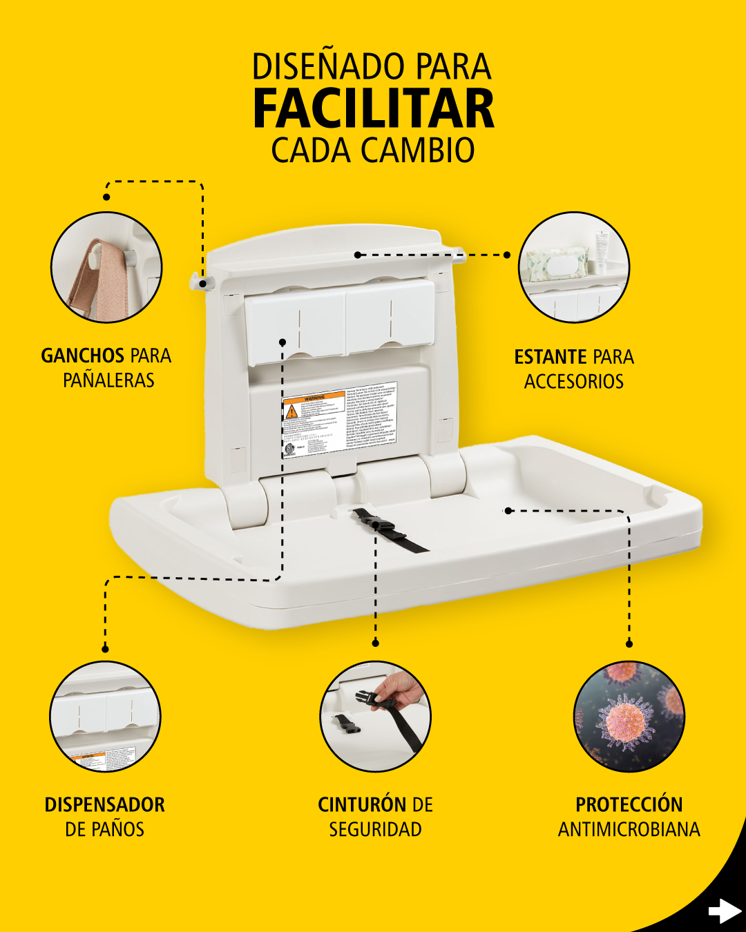 Nuestras estaciones cuentan con protección antimicrobiana que reduce el crecimiento de hongos y bacterias, evitando manchas y malos olores. Diseñadas para garantizar comodidad y seguridad, ofreciendo un cambio rápido y confiable en todo momento.