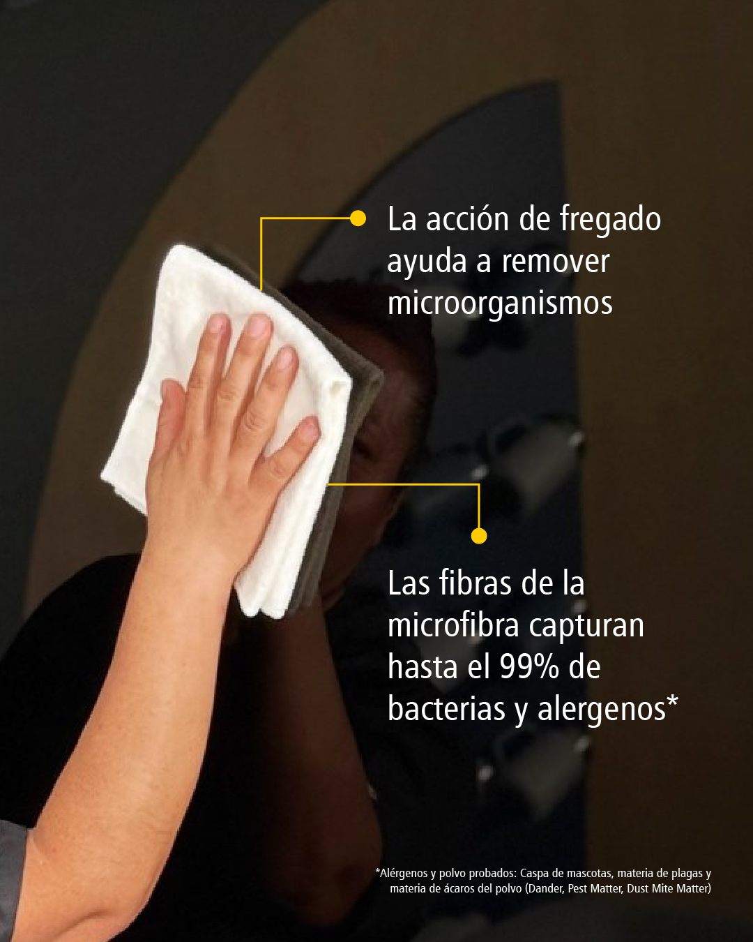 Los paños de microfibra de uso general se adaptan a múltiples superficies y ayudan a remover hasta el 99% de polvo, bacterias y alérgenos probados.